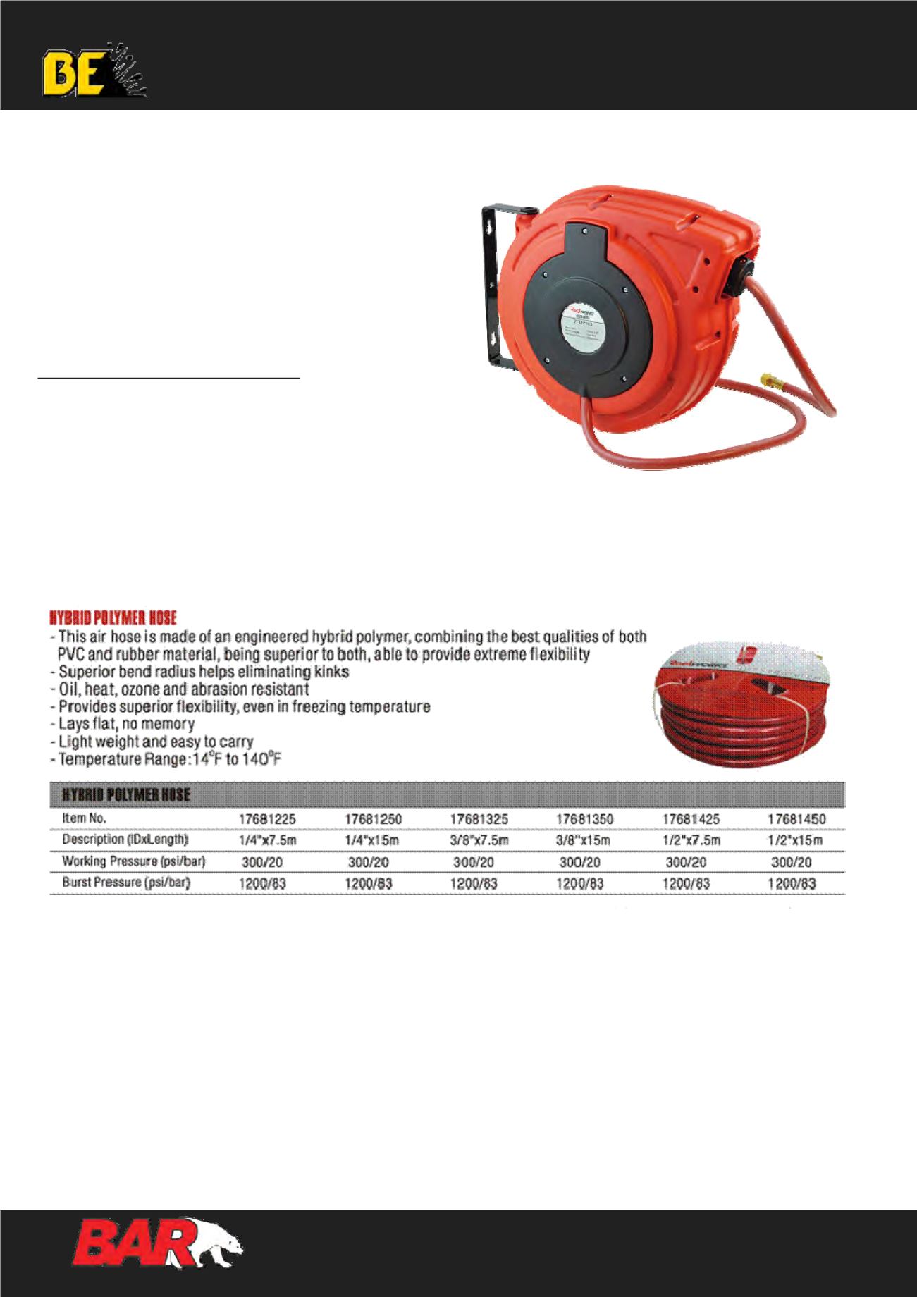 Supplied complete with 15 metre x 3/8" super flexible Hybrid polymer hose, 1.5 metre inlet hose and integral pivoting wall bracket.